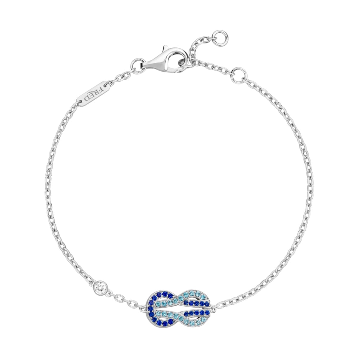 Bracelet Chance Infinie FRED, moyen modèle, or blanc pavé saphirs et topazes et un diamant serti clos