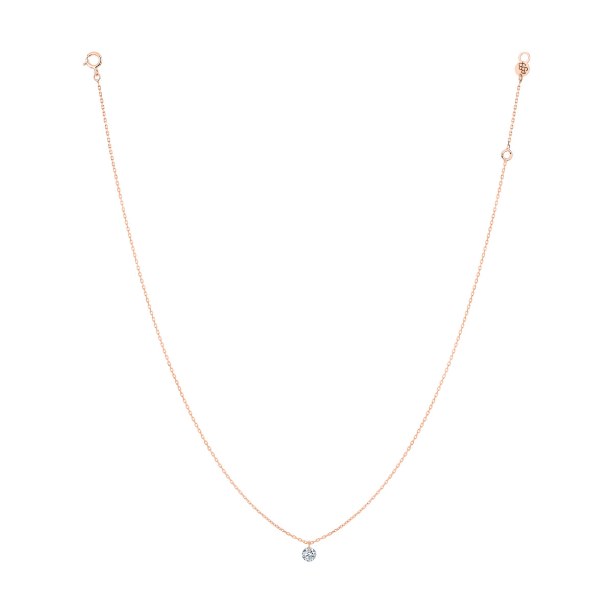 C’est paré d’or rose que se présente le collier signature LA BRUNE & LA BLONDE, le collier 360°. Interprétation moderne de l’indémodable solitaire, le diamant, ici libéré du poids de l’or, joue avec la lumière et frissonne au creux de votre cou en une myriade d’éclats.
