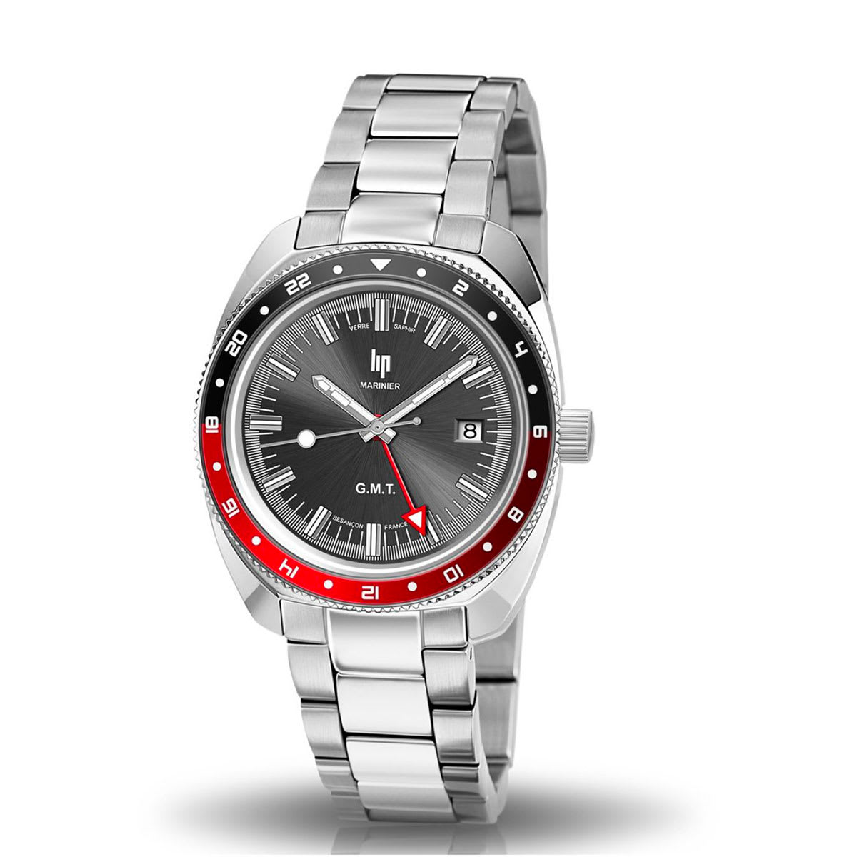 La MARINIER GMT, véritable baroudeuse pour voyageur au long cours, reste fidèle à ses origines de plongeuse avec une couronne vissée, une étanchéité de 20 bars, un mouvement Ronda suisse et un usinage en acier 316L. La lunette tournante se voit modifiée pour recevoir un affichage 24H. Une 4ème aiguille, présentant un deuxième fuseau horaire, trouve sa place sous les 3 principales aiguilles.