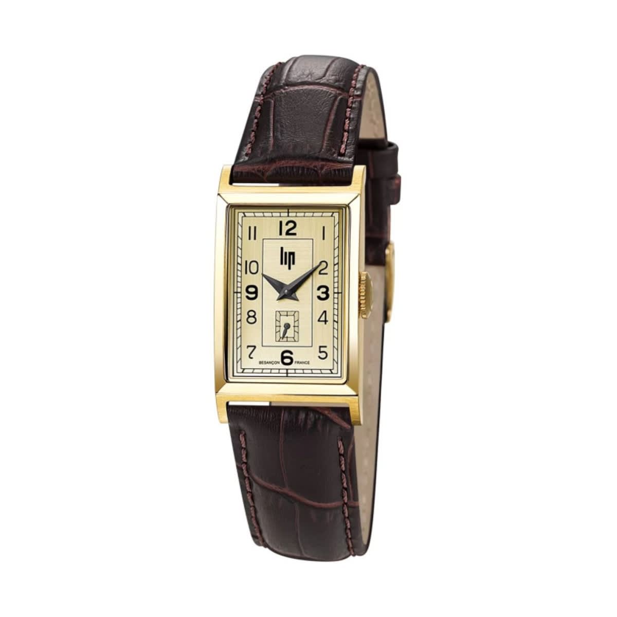 Prix de vente conseilléMontre Lip Churchill T18 est de forme rectangulaire, cadran et boitier doré, les aiguilles et index sont noirs.