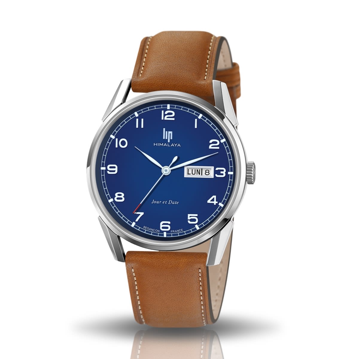 Montre Lip Himalaya, cadran bleu avec chiffres ainsi que date et jour, aiguilles argentées.
