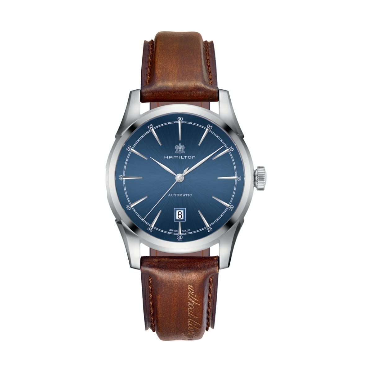 Le mouvement Hamilton H-10 avec ses 80 heures de réserve de marche, sa décoration unique et son rotor squeletté, ajoute une touche de modernité à cette montre traditionnelle haute précision.